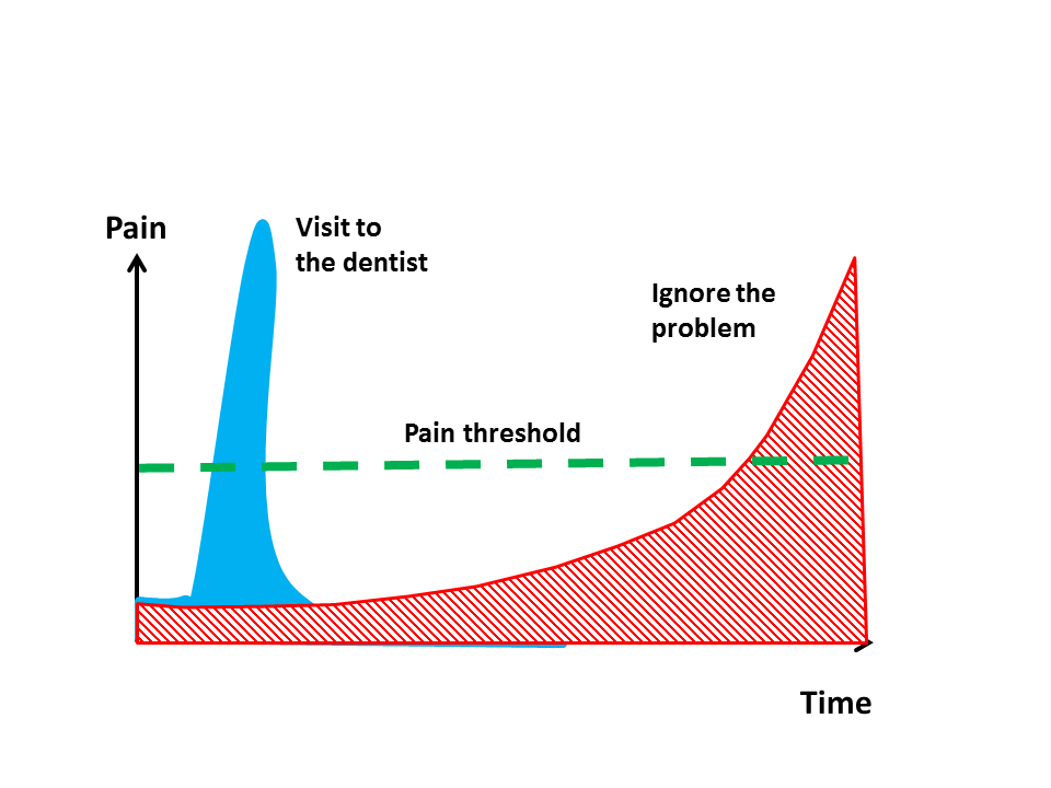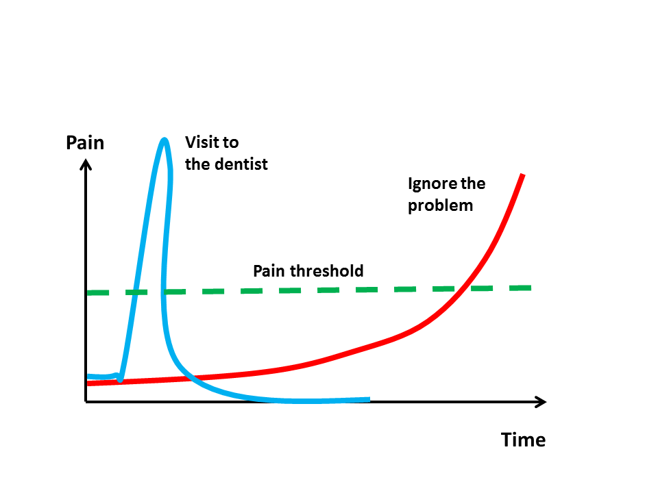 Now the problem is obvious. The long-term pain (red line) gets worse and worse. There is a very good chance that the tooth will go rotten and we will end up passing the pain threshold anyway. Even if we don’t eventually cross our pain threshold the problem may rumble on for an extended period.